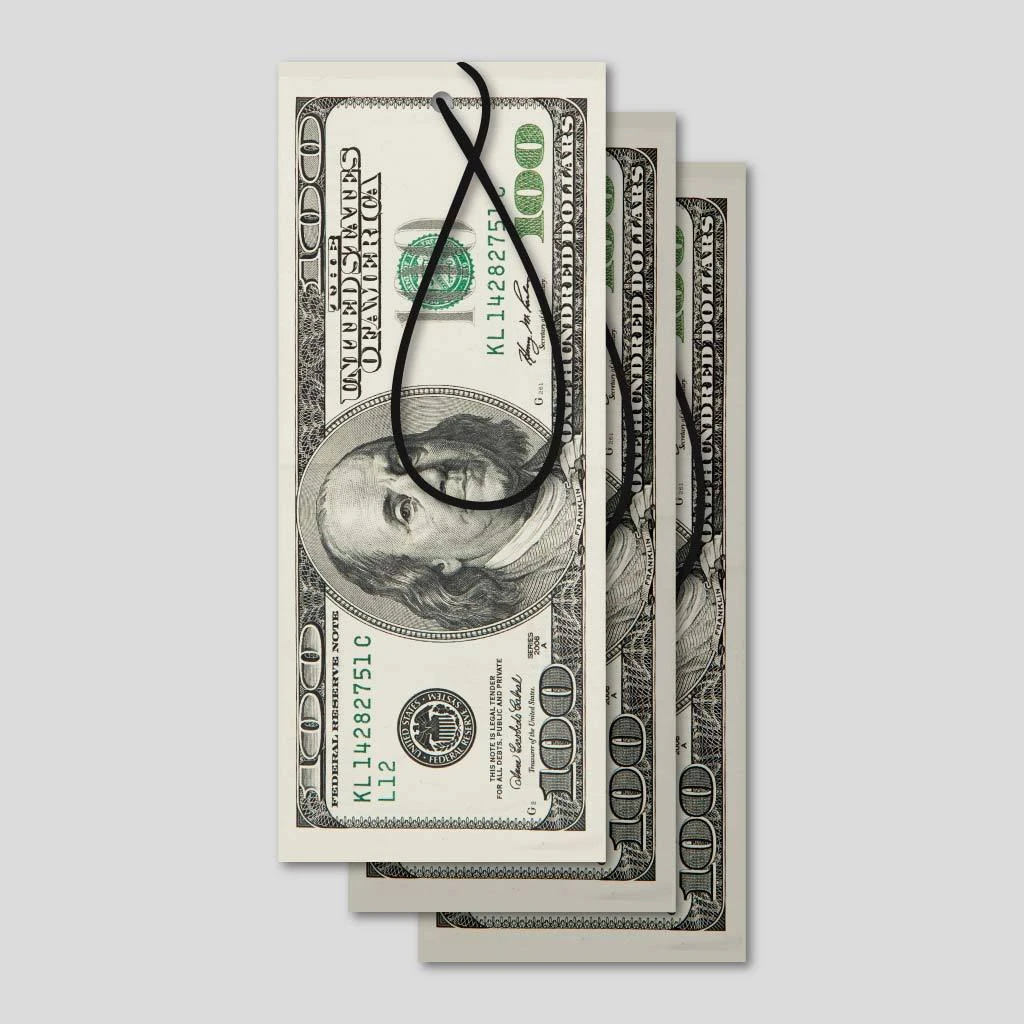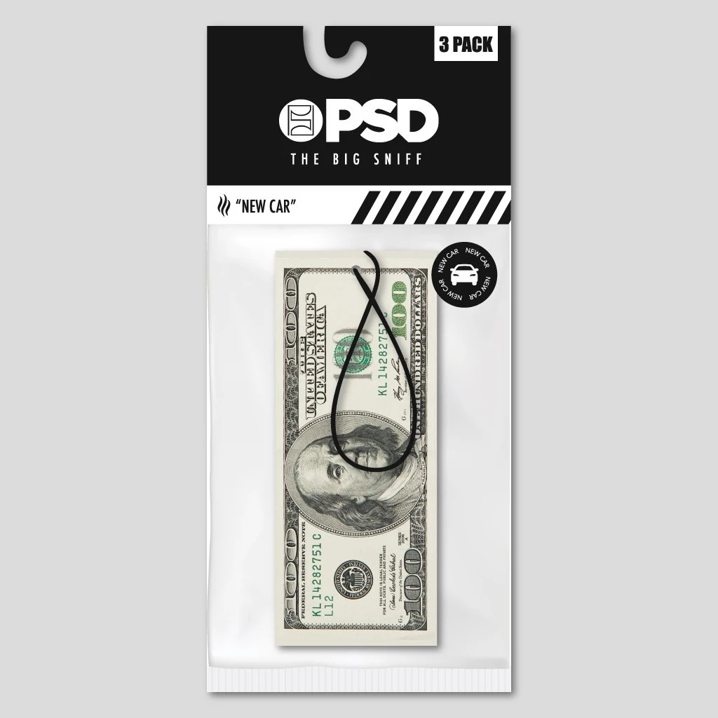Give your car a new style and scent with PSD’s new “100 Dollar Bill” air freshener 3-pack. With a large photo of a $100 dollar bill and “new car” smell, this air freshener will do its job freshening your car in style.